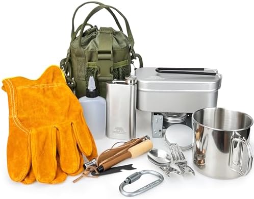Package Contents: Contains an Oxford material crossbody bag, 800ml aluminum lunchbox, 16oz folding chrome steel mug, transportable chrome steel fork and spoon, hearth starter and air blower, collapsible range stand and mini range, plastic bottle, flask, leather-based heat-resistant gloves, and a carabiner