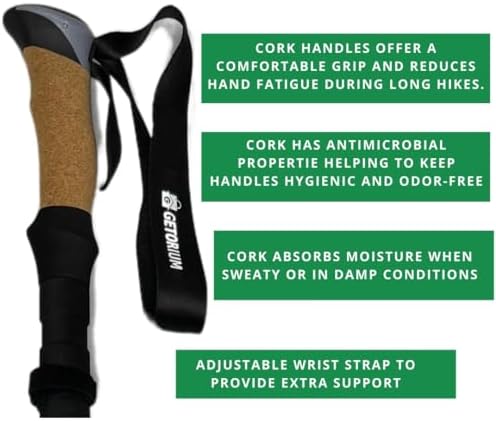 Ergonomic cork grips and adjustable wrist straps guarantee a safe, sweat-free grip for lengthy hikes.