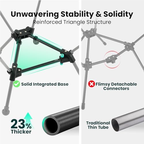 Adaptable & Time-Examined: The enlarged spherical silicone anti-sinking foot effortlessly handles varied terrains, offering an elevated floor contact space that forestalls sinking on sand or gentle surfaces whereas enhancing traction. With a 23% thicker 16mm Plane-grade aluminum tube wall in comparison with different camp chairs and a sturdy triangular construction, it ensures unmatched stability. The tear-resistant 600D Oxford material ensures long-lasting use with out collapsing.