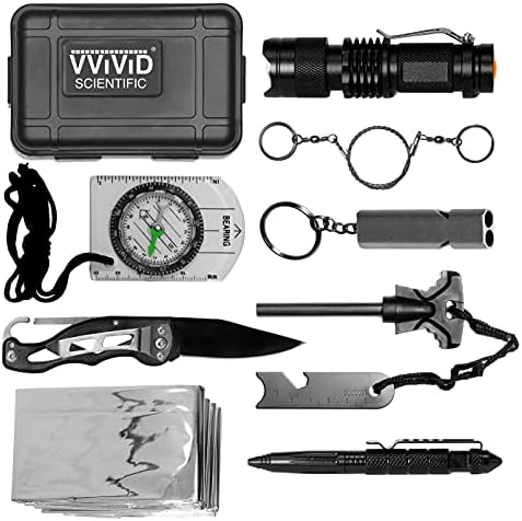 VViViD Survival Equipment, 10 Pcs Important Out of doors Gear, Thermal blanket, Ferro Rod, flint striker, Compass, Emergency Whistle, Noticed, Tactical Pen, Flashlight, Pocket Knife, Waterproof Case