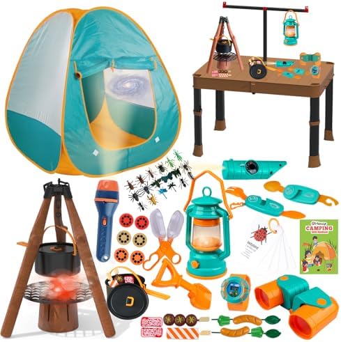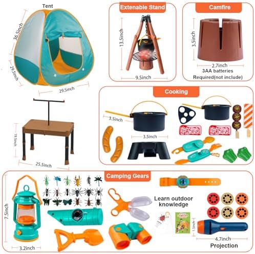 Battery Powered Youngsters Tenting Gear Toys: A real-to-life campfire with extendable stand and oil lantern can mild up with 3 AA batteries (not included) and regulate the binoculars to see the world.