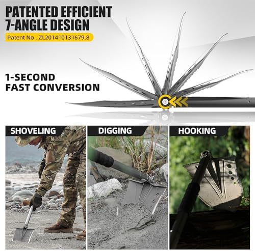 7 Key Angles Lock Patent: With only one hand, you’ll be able to shortly regulate the tactical shovel to 7 completely different angles. This compact survival shovel package is designed to offer the quickest rescue in an emergency. It is patented beneath No.-ZL201410131679.8.